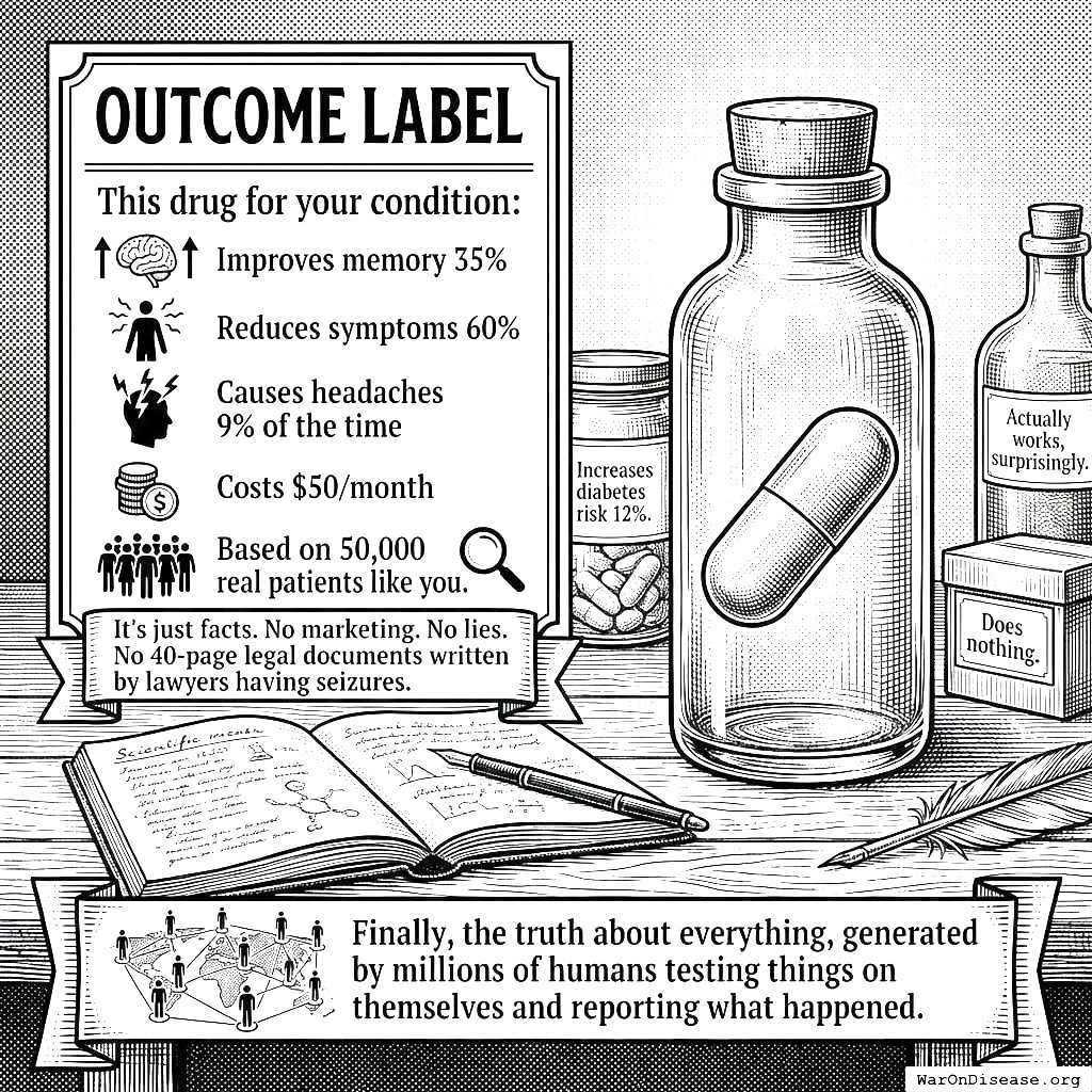 Outcome labels replace “ask your doctor” with actual facts. “Improves memory 35%. Reduces symptoms 60%. Causes headaches 9% of the time. Based on 50,000 real patients like you.” Just truth. No marketing. No 40-page legal documents written by lawyers having seizures.