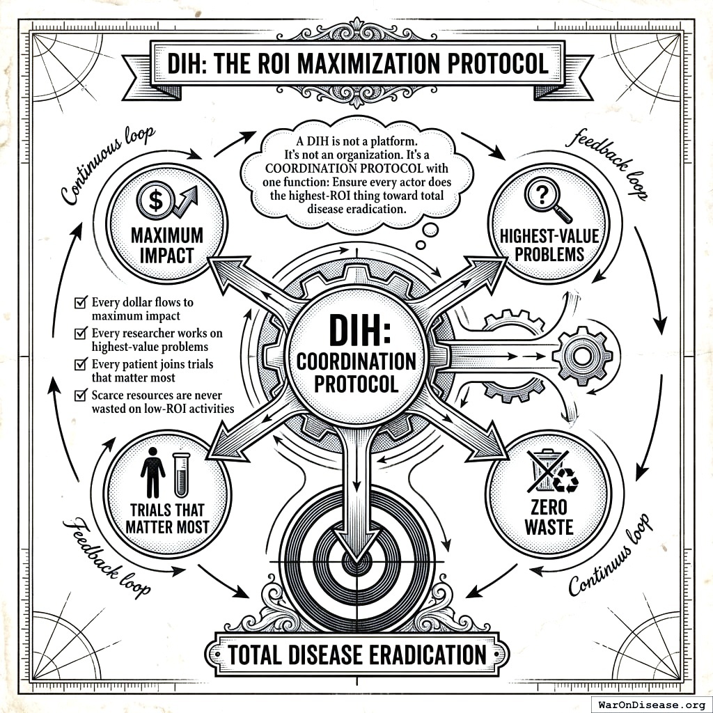 Receive funds. Allocate research via patient subsidies. Govern infrastructure via Wishocracy. Verify results. Pay for outcomes. The highest-ROI action becomes the selfish choice for every actor. Greed cures cancer. Selfishness ends disease. Your worst impulse becomes your best medicine.