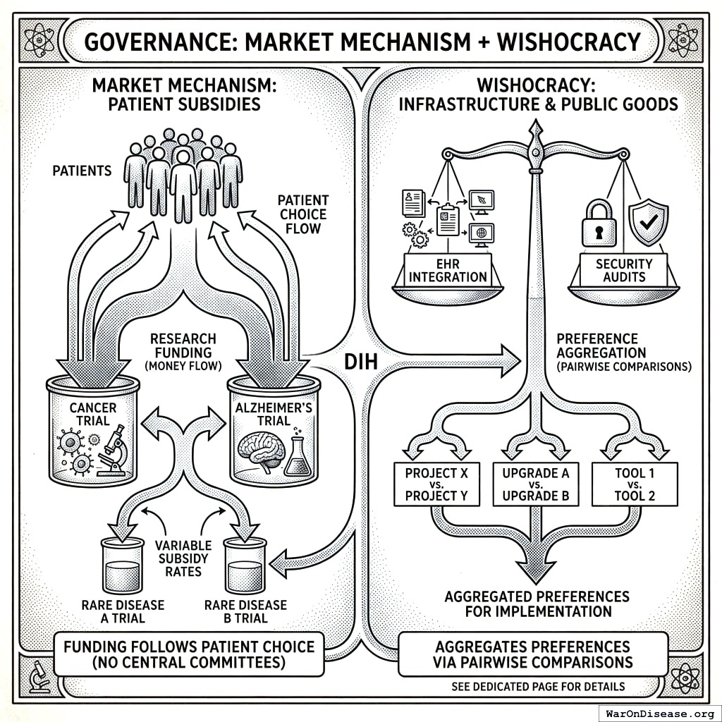 Your Decentralized Institutes of Health is not a research institution, a trial platform, or a funding agency. It’s the thin layer that coordinates all of them. The 1% Treaty Fund receives the money. Patient subsidies allocate research funding (sick people choose trials, money follows). Wishocracy allocates infrastructure through democratic voting. Trial infrastructure provides clinical trial services through competing providers. Incentive Alignment Bonds149 align investors and politicians with outcomes through legal bribery.