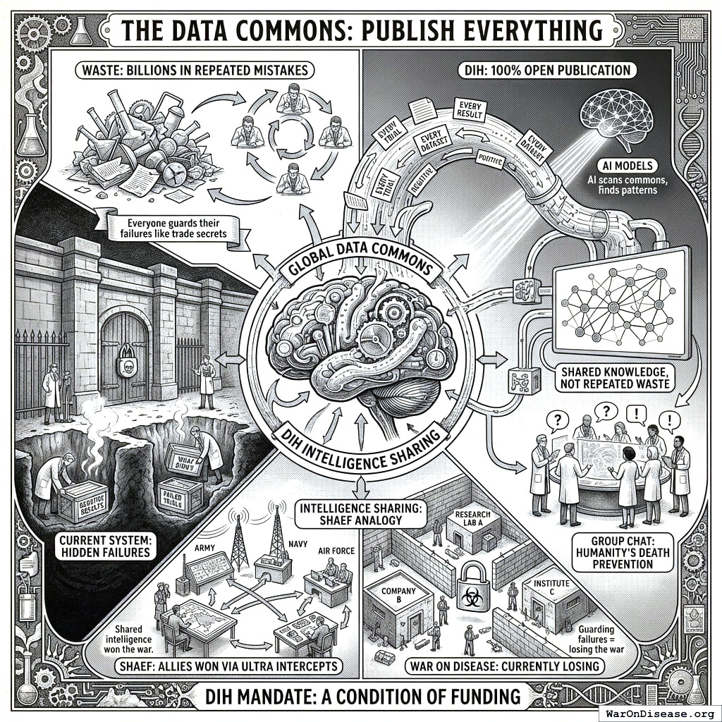 This is intelligence sharing in the SHAEF analogy. Your Allies won partly because they shared Ultra intercepts across commands. Your war on disease loses because everyone guards their failures like trade secrets. It’s a group chat where everyone shares what didn’t work. Except the group is your entire species and the topic is death prevention, which you’d think would motivate sharing, but doesn’t, because your scientists are more afraid of looking wrong than of people staying dead.