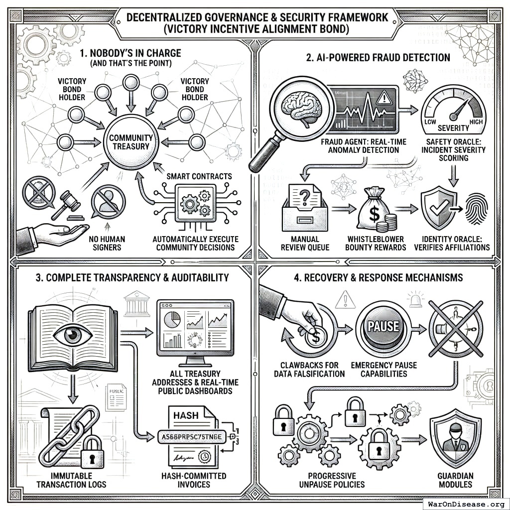 Your Decentralized Institutes of Health makes capture economically irrational by removing everything worth capturing. No CEO to bribe. Rules encoded in auditable systems (you can’t bribe an algorithm; several of your corporations have tried; the algorithm didn’t notice). Every dollar tracked on a public ledger, so corruption is visible to everyone with an internet connection. Anyone can build a competing alternative, so capturing one just triggers the creation of another. Billions vote via Wishocracy, so lobbying doesn’t scale. You can bribe a committee of twelve. You cannot bribe a billion, because the bribe would cost more than the contract you’re trying to win (and even your species can do that arithmetic). Funding is determined by outcomes, so gaming the system is harder than just performing well, which is the first time in your history that a funding system has had that property.